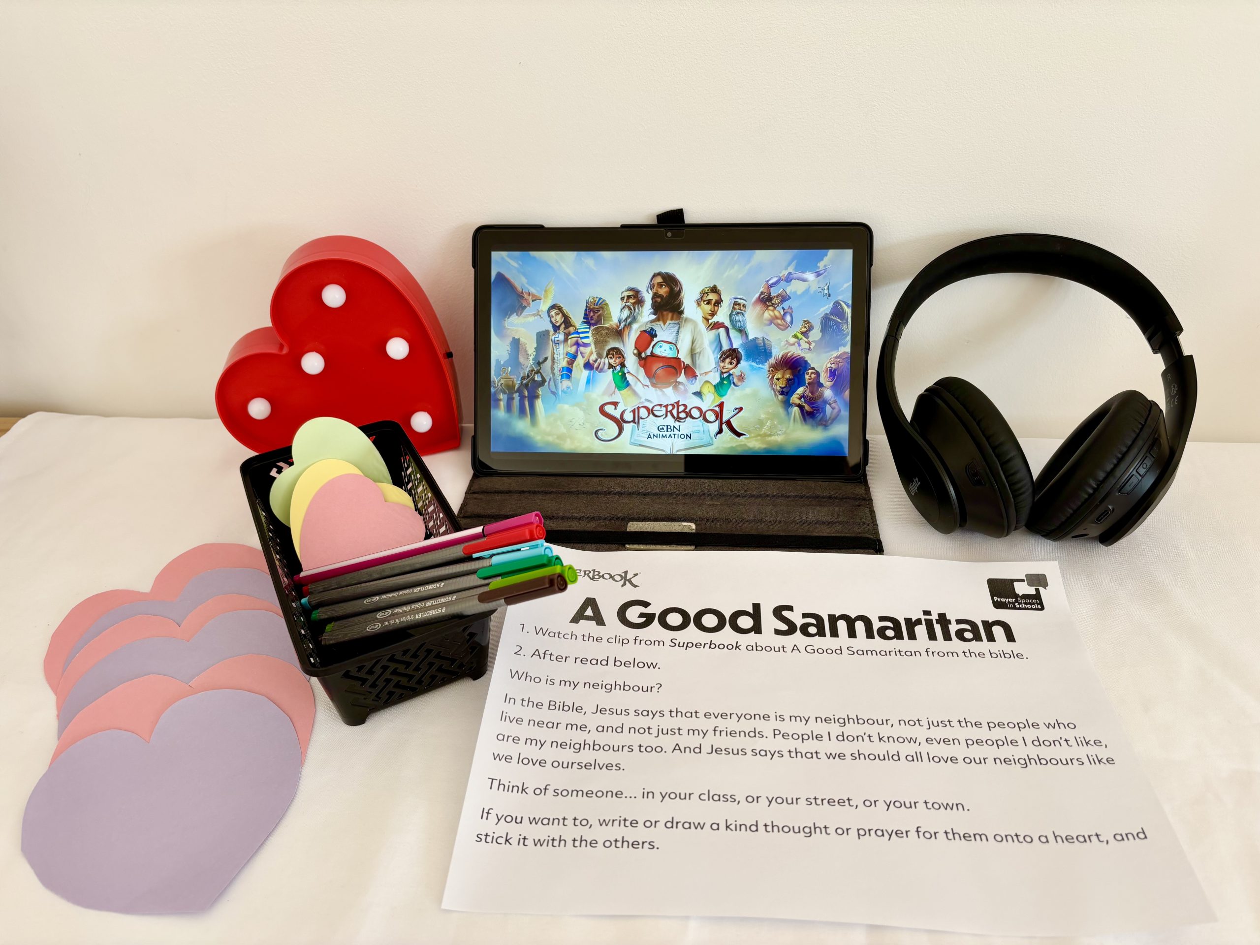 This prayer activity invites pupils to watch a short condensed episode from Superbook on A Good Samaritan then afterwards reflect and, if they choose to pray on the theme of loving our neighbours.